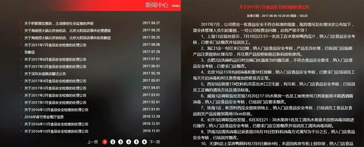 海底捞每个月都会在官网进行披露。近期的披露包括,北京某分店消毒柜灯故障,珠海某店西瓜放在地上,长沙某店水果房员工未按消毒流程操作等等,不计其数。看似详细的披露和严格的制度,真正作用有待考量。