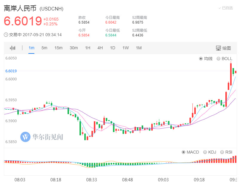 离岸人民币兑美元同样跌破6.6关口,日内跌约150点。