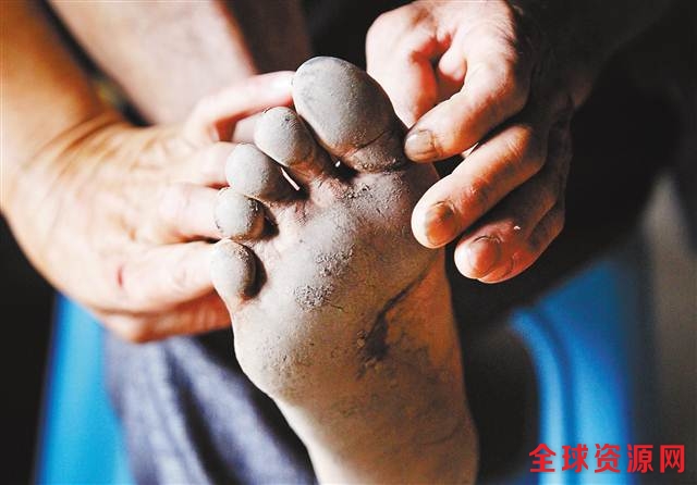 由于曹树才长期赤脚走路,脚上已经全是老茧。