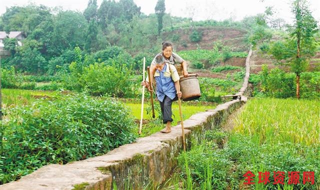 看不见的曹树才背着老伴在仅有30多厘米宽的田坎上行走,靠手中的两根竹竿和老伴的指挥确定方向。