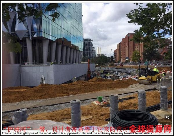 “护城河”一瞥,大使馆前有个100英尺宽的半月形水带。尽管美国官员委婉地称其为“水景”,但设计者寄希望于它来防范可能的恐袭。