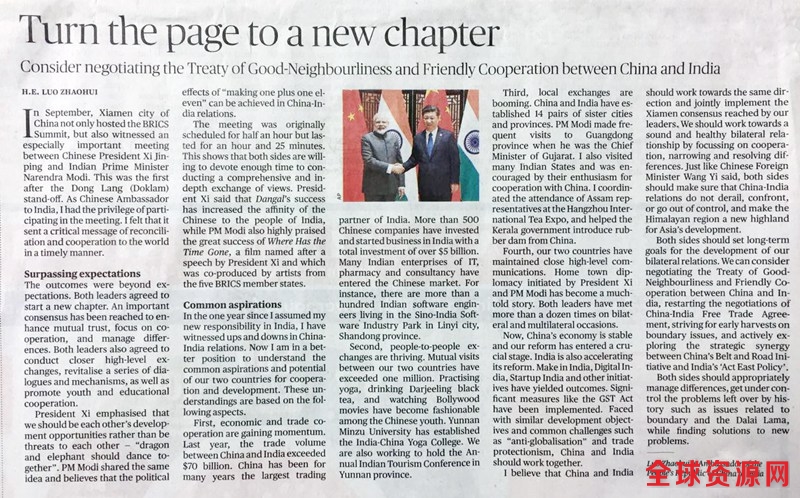 9月22日,罗照辉大使在印度知名英文媒体《印度教徒报》发表署名文章《翻旧页 开新篇 中印关系前景可期》,解读习近平主席与莫迪总理厦门会晤重要意义,展望中印关系下一步发展方向。全文如下:
