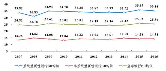 注:图中蓝色柱为系统重要性银行2016年BII均值,红色柱为非系统重要性银行2016年BII均值。纵轴各国名称后数字表示参评银行数目,其中“中国(4)”代表中国四大行BII均值,“中国(6)”代表中国非系统重要性6家参评银行BII均值。