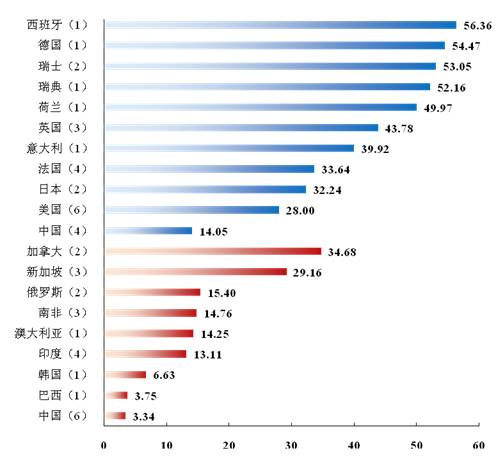 报告认为,发达国家与发展中国家银行国际化差异明显。参与BII评分的发达国家银行共29家,来自14个国家,发展中国家银行共20家,来自5个国家。
