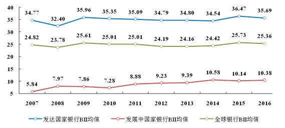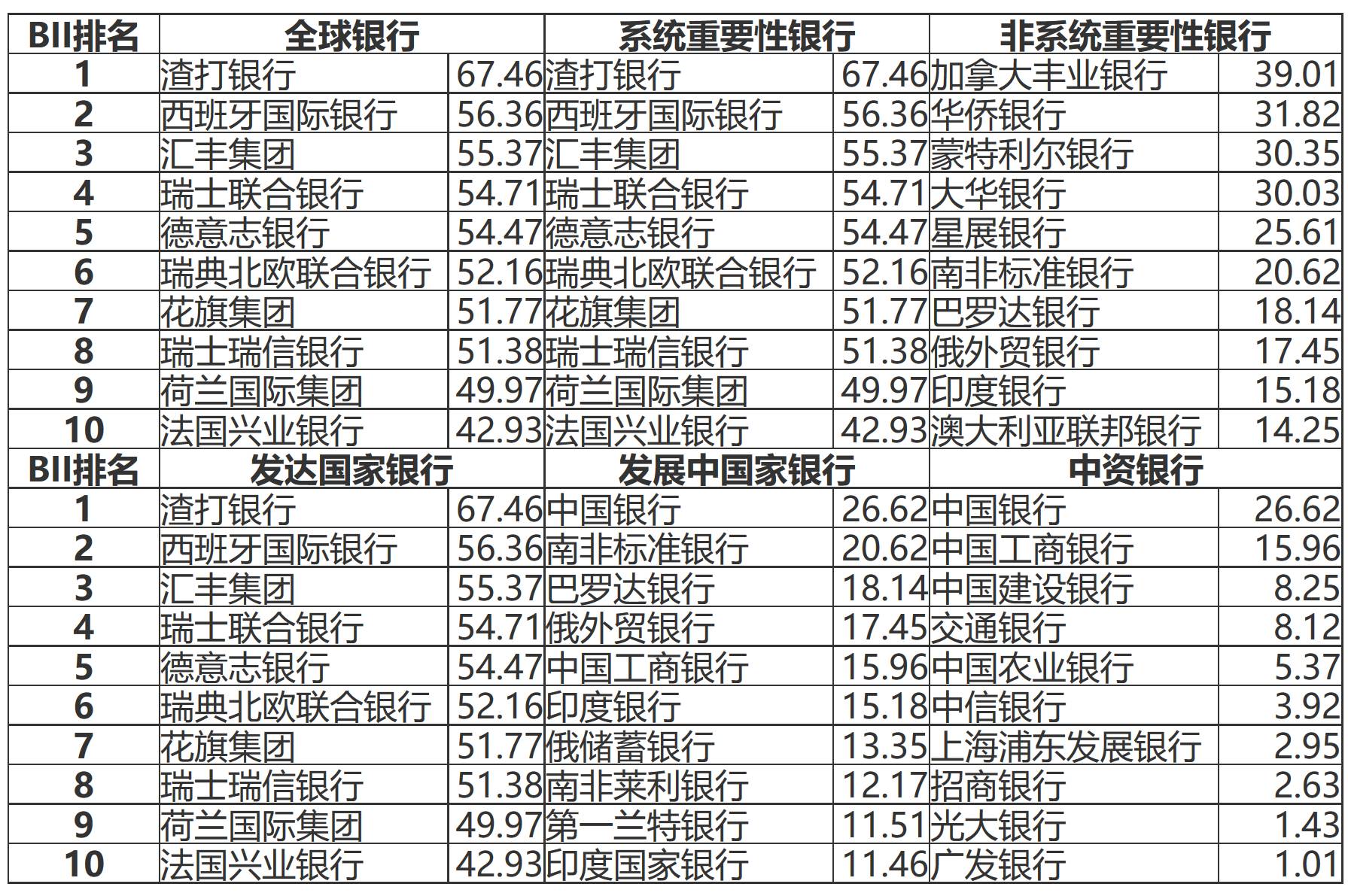 注:花旗集团、加拿大丰业银行、俄外贸银行、俄储蓄银行2016年数据有缺失,但其前几年数据较全,本表对其BII值进行了合理预测。
