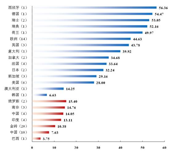 2016年全球银行BII分值前十名均为发达国家银行与系统重要性银行,且基本来自欧洲地区;发展中国家BII前十名中印度、南非各有3家,中国、俄罗斯各有2家。拓展至全球BII前20名银行,均为发达国家银行:其中,法国占有三家,英国、美国、日本、加拿大、新加坡各占有两家。发展中国家在前50%的排名(即前25名)中仅有中国银行一家占据第21位,南非标准银行、巴罗达银行、俄外贸银行、中国工商银行则进入了排名前30位,除中国银行与南非标准银行外,其余发展中国家银行2016年BII分值均在20以下。