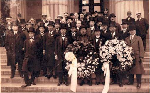 1915年巴拿马万国博览会期间,中国政府组织中国商业报聘团赴美,张弼士任团长,黄炎培任秘书。前排右起第四人为张弼士
