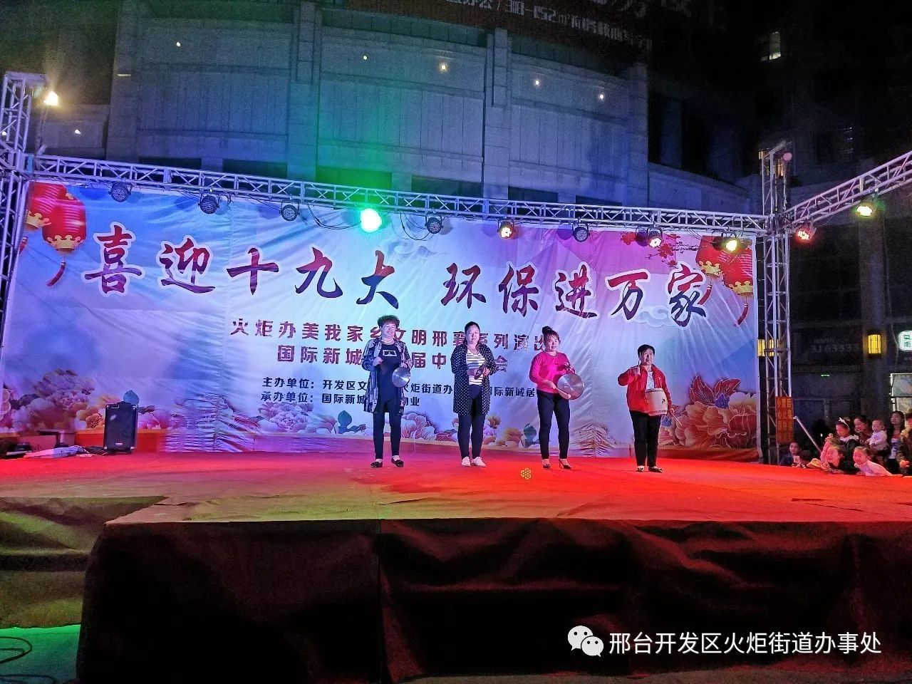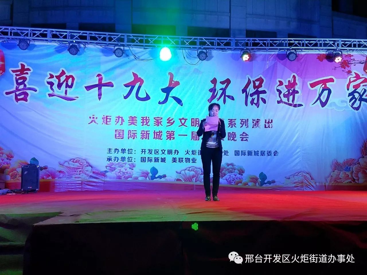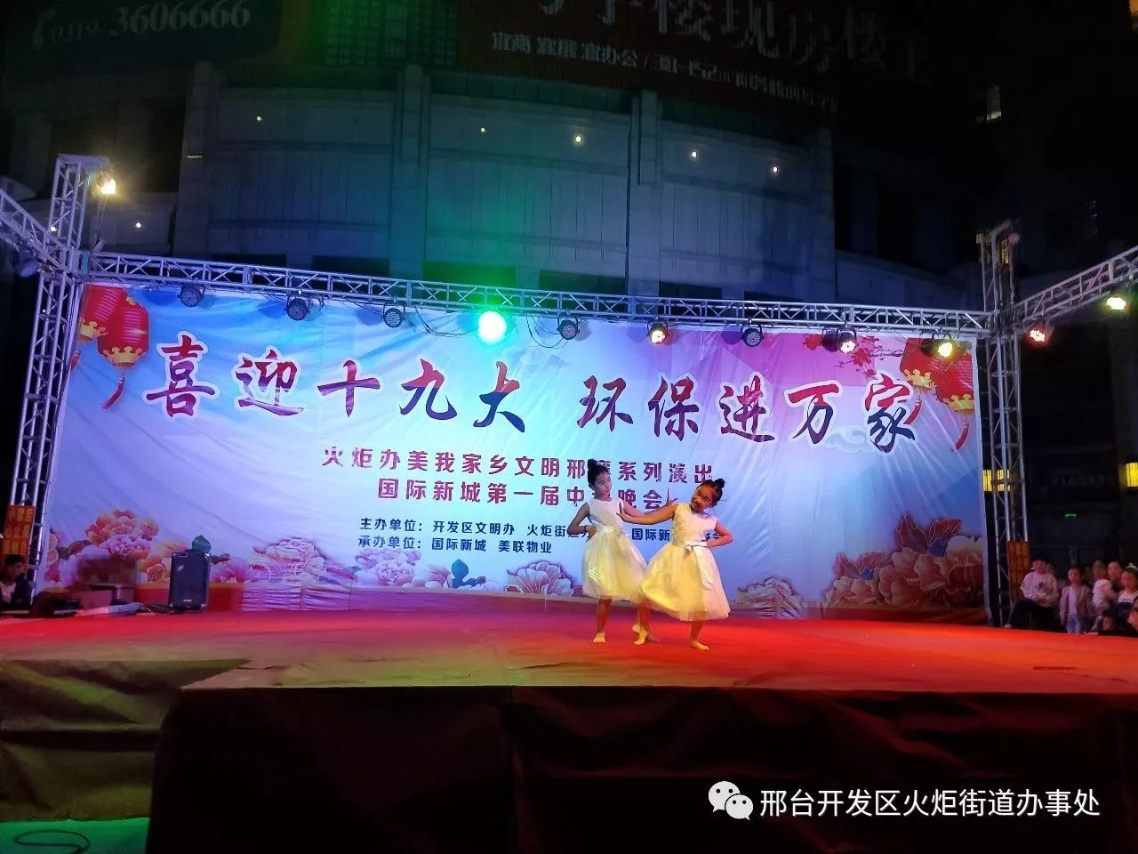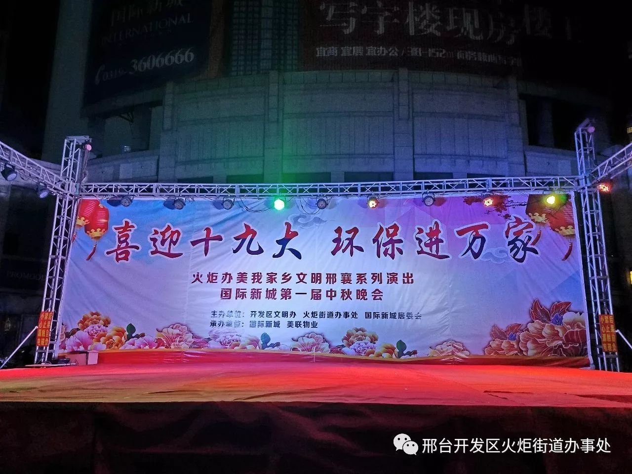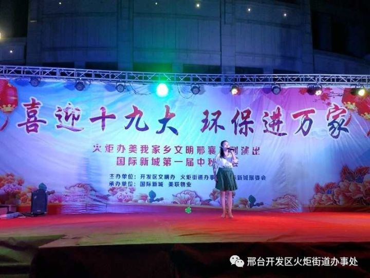 9月28日晚7点半,国际新城广场人员鼎沸,大家呼朋引伴的赶过来,只见广场上张灯结彩,霓虹灯下“喜迎十九大,环保进万家”的大幅海报格外耀眼,原来是火炬办在国庆68周年和中秋佳节即将来临之际,携手国际新城居委会在这里隆重举行文艺汇演,庆祝祖国母亲的68岁华诞。