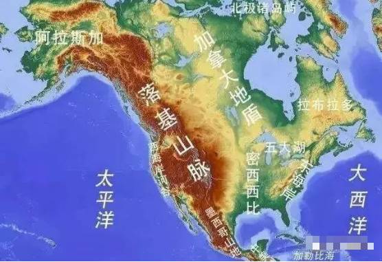 与咱们中国地形大为不同,整个北美洲的山脉,基本都是南北走向。(请看下图)