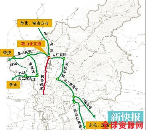 2.往佛山方向的车辆:乐广高速(花山北互通立交)—肇花高速—广清高速(S114、S118)—西二环高速—佛山方向;