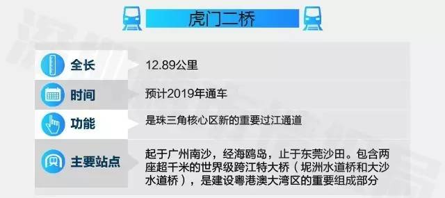 虎门二桥全长12.89公里,概算111.8亿元,起于广州南沙,经海鸥岛,止于东莞沙田,是建设粤港澳大湾区的重要组成部分,还是珠三角核心区新的重要过江通道,2013年12月开工,预计2019年建成通车。