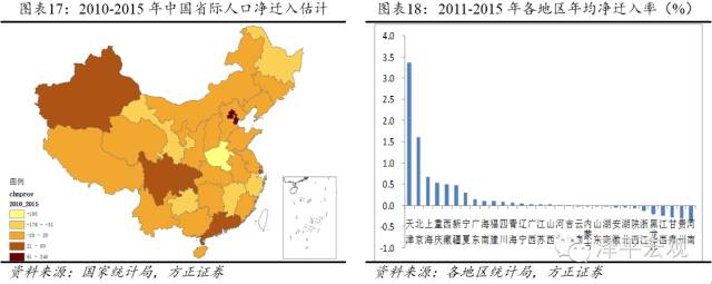 在省际层面,2010-2015年人口净迁入的第一集中地是京津地区,中西部外来务工人员大量回流造成长三角、珠三角净迁入人口大幅减少。2011-2015年间,天津常住人口年均增加51万,较2000-2010年的年均29万人大幅增加;北京受人口调控影响,常住人口年均增量从之前的60万降至42万。长三角、珠三角人口净迁入规模明显减少,常住人口年均增量分别从207万降至64万、191万降至83万;其中,浙江很可能因外来务工人员回流呈现人口净迁出,常住人口年均增量从85万降至19万。东北地区人口外流明显,常住人口年均增量从46万人降至-1万人,特别是黑龙江。川渝地区常住人口增量从-16万人增至59万人,可能表明其长期的人口大规模净迁出趋势开始转变,重庆甚至可能转为净迁入。