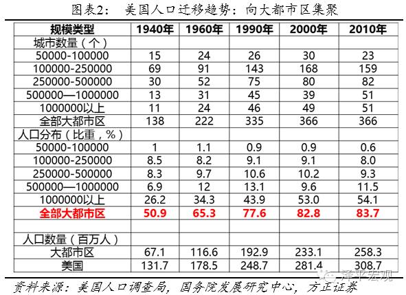 1)人口向郊区(suburbs)集聚明显。1910-1930年,美国市区(central cities)人口比重提高约10个百分点,明显超过郊区人口比重增幅(7个百分点)。但之后,市区人口比重基本保持不变,而郊区人口比重从14%增至51%。这意味着:1930年之前,人口主要迁入美国都会区的市区;但在之后,人口主要迁入郊区,包括市区人口外迁郊区。美国人口郊区化以小汽车的大规模使用为通勤的技术条件,其主要原因是中产阶级为寻求更好的中小学教育、更安全的邻里环境和更稳定的财产价值;而市区人口多为低收入者,包括黑人。不过2008年金融危机后,美国市区人口比重明显上升,主要原因可能在于就业考虑和市区房产不便出售等。