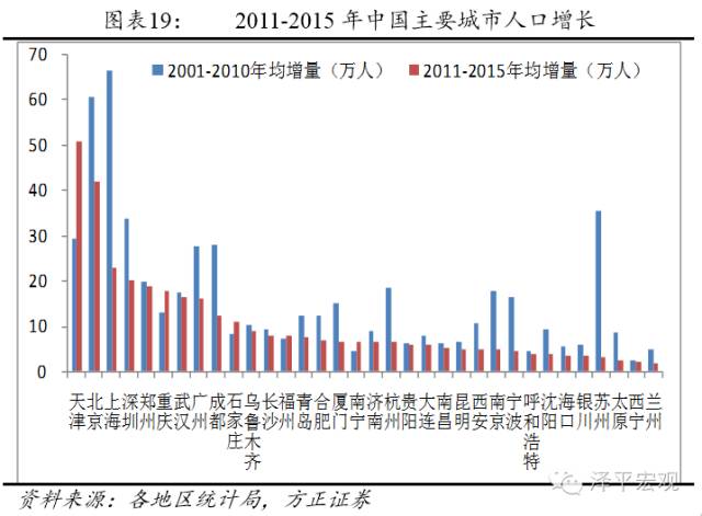 在城市层面,人口向一线城市和区域中心城市集聚速度整体放缓,且分化明显,但趋势未改。2011-2015年间,除天津、重庆(主城9区)、石家庄、南宁和福州外,其他城市常住人口年均增量较2001-2010年均有不同程度的减少。其中,天津、重庆(主城9区)常住人口年均增量较之前明显增加,重庆(主城9区)常住人口年均增量从之前的13.0万增至17.8万;石家庄常住人口年均增量从之前的8.2万增至10.8万,南宁从之前的4.5万增至6.5万,福州从之前的7.3万增至7.7万;郑州、武汉常住人口年均增量较之前减少不到1万人,继续保持在16-20万人;苏州、南京、宁波等常住人口年均增量大幅减少,分别从之前的35.5万降至3.0万、17.7万降至4.6万、16.4万降至4.4万,苏州可能呈现人口净迁出。