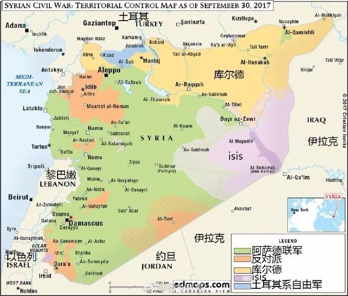 为何土耳其如此紧张,一定要出兵叙利亚,我们来先看一张叙利亚的控制区域图就明白了: