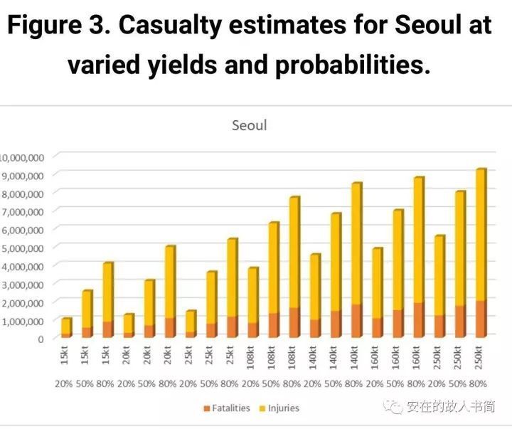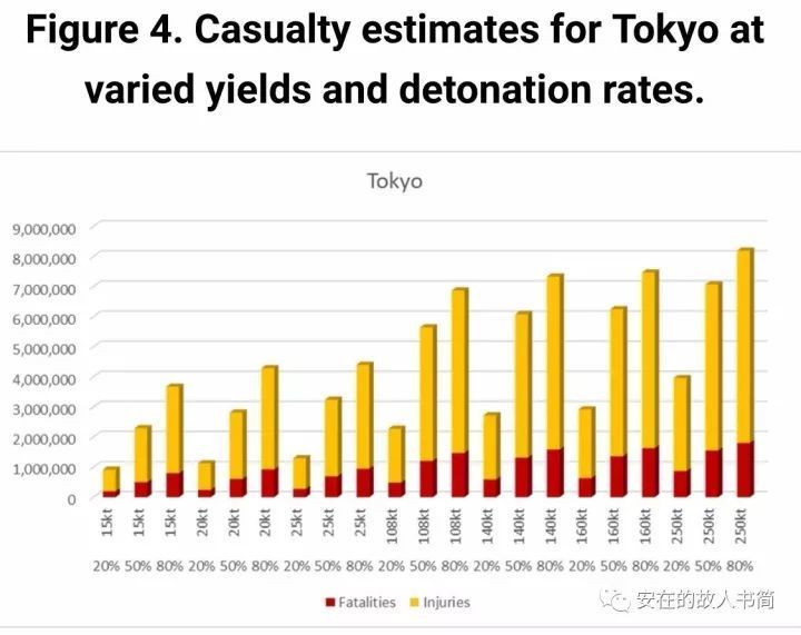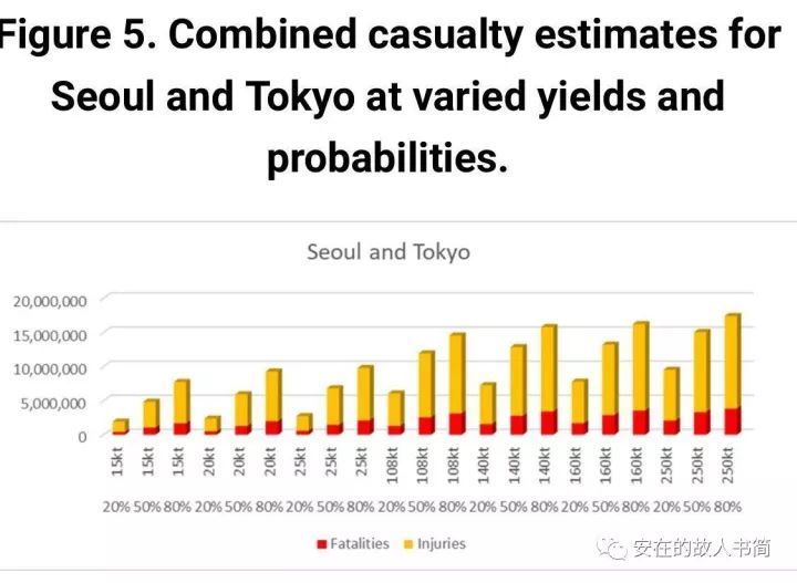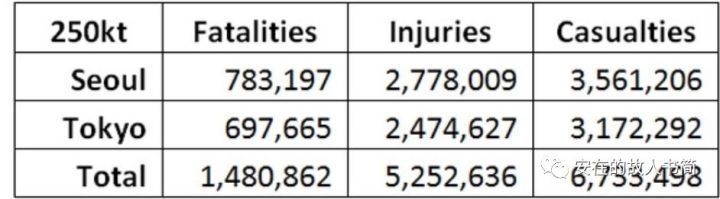 基于以上这些假设,一个250千吨的可靠核弹头在首尔或东京的市中心爆炸,预计的伤亡人数如下: