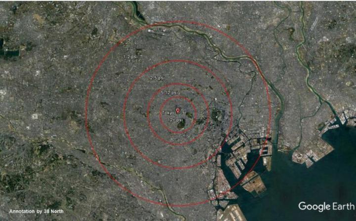 东京的地图展示的250千吨核弹空爆时的四个爆炸超压区域:12+ psi、5-12 psi、-5 ps