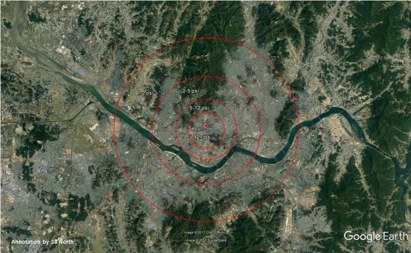 首尔的地图展示的250千吨核弹空爆时的四个爆炸超压区域:12+ psi、5-12 psi、-5 ps