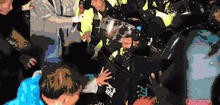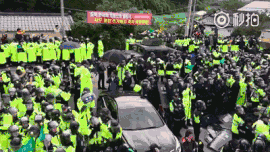 ▲资料图片:4月27日,韩美当局突袭式将两辆“萨德”系统发射车运抵星州高尔夫球场。图为“萨德”入场遭遇民众激烈阻挠。