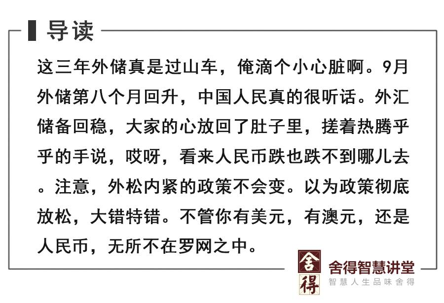 外汇储备回稳,大家的心放回了肚子里,搓着热腾乎乎的手说,哎呀,看来人民币跌也跌不到哪儿去。