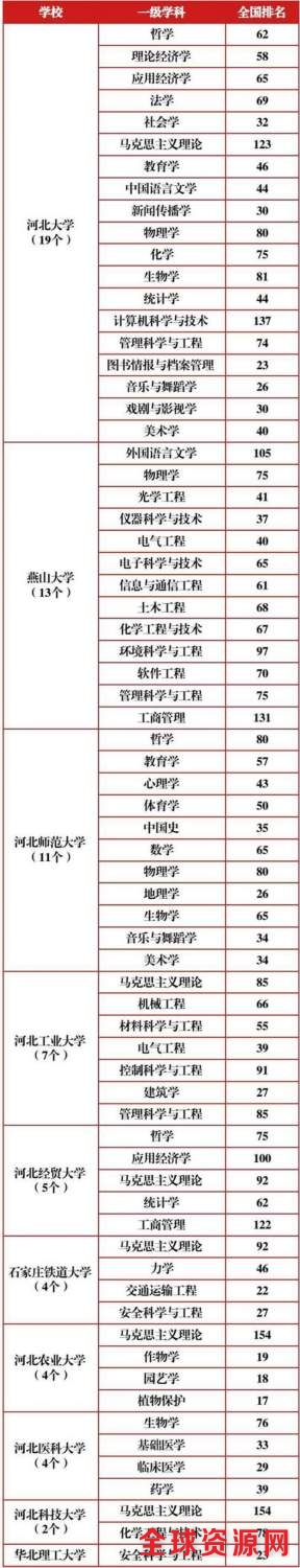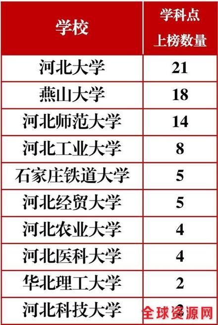 除前两项外,河北省还有70个学科点上榜。其中,河北大学19个学科点,数量最多;燕山大学13个,河北师范大学11个,排在第2、3名。