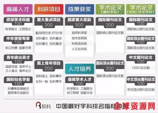 中国最好学科排名的指标体系由软科开发的学科发展水平动态监控系统内嵌的30余项测量指标所组成,30余项指标划分为10余个指标维度分别计算得分,然后归纳为高端人才、科研项目、成果获奖、学术论文、人才培养5个指标类别,最后汇总得到学科点的总分。不同学科的学科点基数不同,因此竞争的激烈程度也不一样。