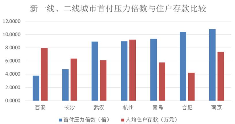 根据统计公报,以及中国房地产业协会数据,《叶檀财经》计算得出,除去三个没有数据的城市,西安在每千人服务人口前10的新一线、二线城市中首付压力最小,为3.7637倍。