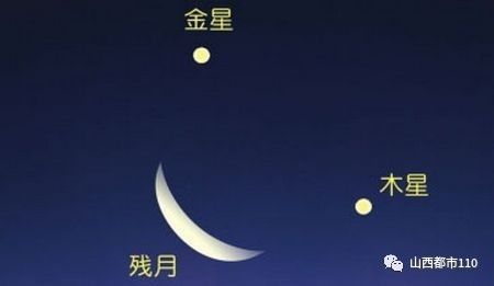 金星和火星仿佛月亮船上抛洒下来的两颗宝石,一亮一暗、一大一小、一白一红,十分有趣。随着时间的流逝,双星和残月不断升高,到了东方露出金色的霞光时,这一天象更显妖娆。