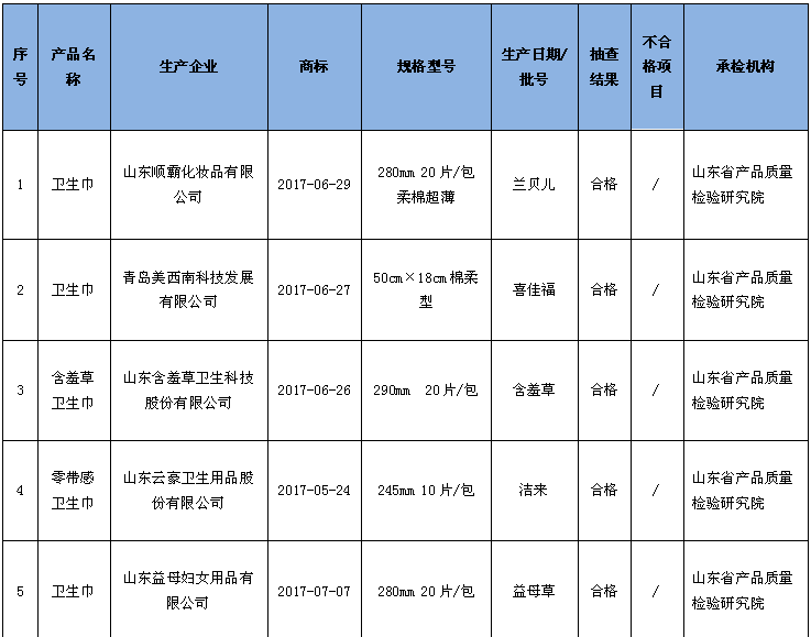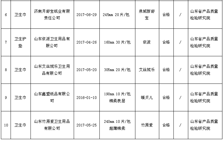 据山东省质量技术监督局官网2017年10月16日消息,2017年第3季度,山东省质量技术监督局组织开展了卫生巾产品质量监督抽查。本次共抽查全省10家企业生产的10批次卫生巾产品,均符合相关标准的规定。