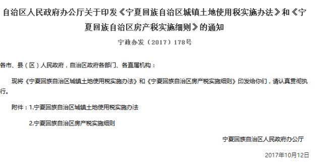 根据宁夏回族自治区官网文件显示,我区已出台《宁夏回族自治区房产税实施细则》,明确宁夏房产税在城市、县城、建制镇和工矿区(包括各类开发区、各类园区)范围内征收,新细则自2018年1月1日起执行。
