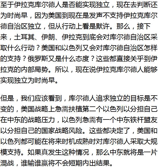 三、库尔德人背后站着美国和以色列,伊拉克背后站着伊朗、土耳其和俄罗斯,大国不妥协,各势力之间难实现终极妥协。