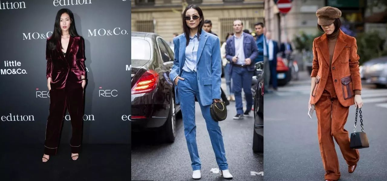 最简单的就是最高级的,当你不愿花心思在搭配上,可以选择成套的丝绒西装,不过要小心,如果你没有大长腿和纸片身材,一定别忘了穿上高跟鞋。