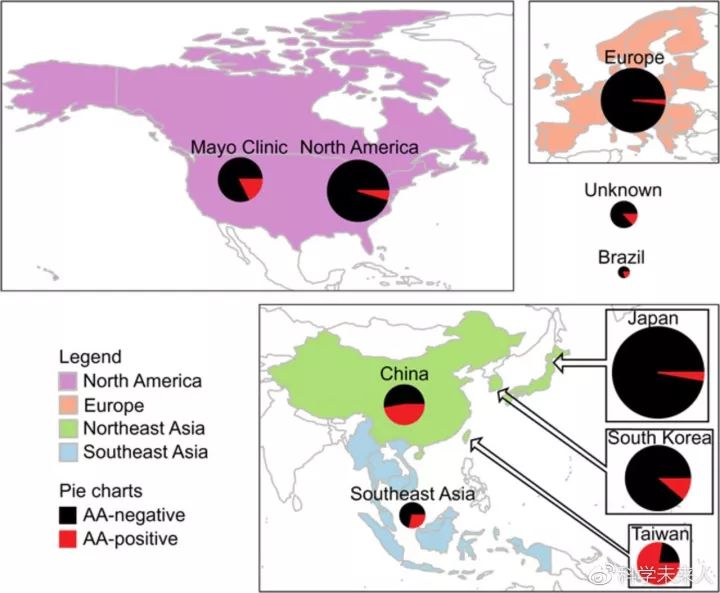 也就是说,检查中,将近八成的台湾肝癌,将近五成的中国大陆肝癌,都是马兜铃酸诱变的(马兜铃酸导致的肝癌,上图标红色部分)。那么,为什么全世界唯独亚洲地区最倒霉呢?