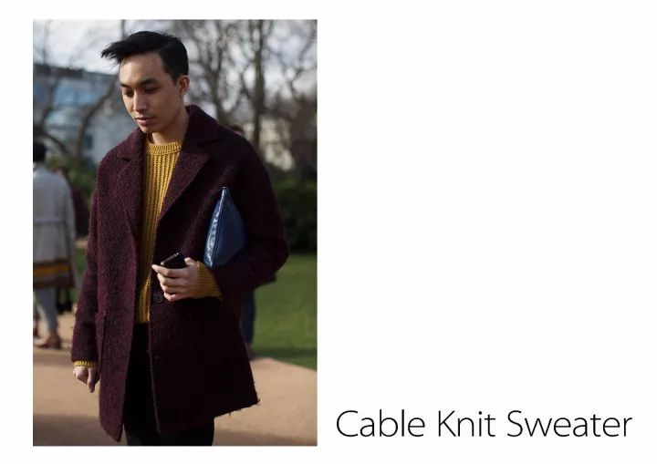 如果你渴望成为一个“办公室暖宝宝”,或者说是看起来像个“暖男”,选择一件暖色系的绞花针织毛衣无疑没错。与秋冬季节的灰冷色当道不同,暖色系单品正好作为冷色系强烈的互补,而绞花针织有着独特的质地与触感,就会使你“看起来就很暖”。