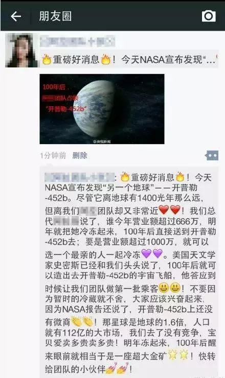 “你们微商咋不上天啊?” “别着急,这不就快了吗?”某微商团队准备登陆“开普勒-452b”。