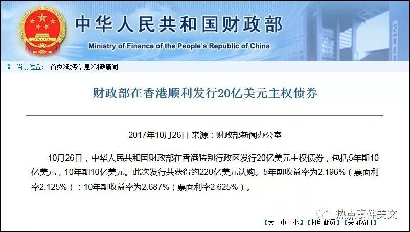 下面,我们再回过头来看今天的新闻:中国财政部抛开三大评级机构在香港特别行政区发行了20亿美元主权债券,共获得约220亿美元认购,为计划发行金额20亿美元的十倍。