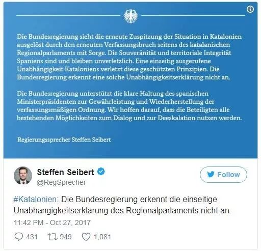 另据德国《法兰克福汇报》网站10月27日报道,在加泰罗尼亚脱离西班牙所引发的冲突中,德国联邦政府再次对西班牙政府表示支持。德国政府发言人斯特芬·赛贝特说,德国政府支持西班牙首相在确保和恢复宪法秩序方面的明确立场。