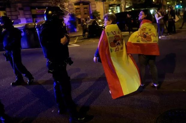 ▲10月27日,支持国家统一的民众与加泰罗尼亚地方警察对视。(路透社)