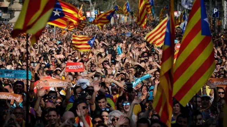 ▲在加泰罗尼亚自治区议会宣布独立后,支持加泰罗尼亚独立的民众在巴塞罗那举行游行活动。(CNN)