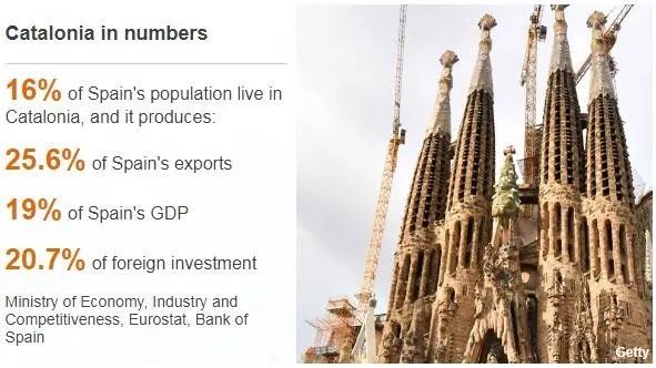 ▲加泰罗尼亚地区基本情况:人口占西班牙的16%,出口占25.6%,GDP占19%,吸引外资金额占20.7%。(BBC)