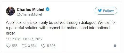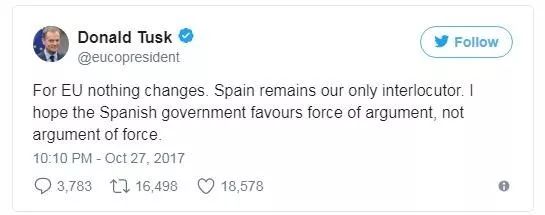 欧洲理事会主席图斯克也表达了同样的立场。他说,西班牙政府仍然是欧盟在西班牙的“唯一对话伙伴”,对欧盟来说,西班牙“没有任何改变”。
