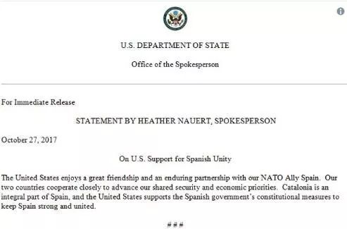 美国明确表示,“加泰罗尼亚是西班牙不可分割的一部分”,美国支持西班牙政府采取措施维护国家的“强大和统一”。