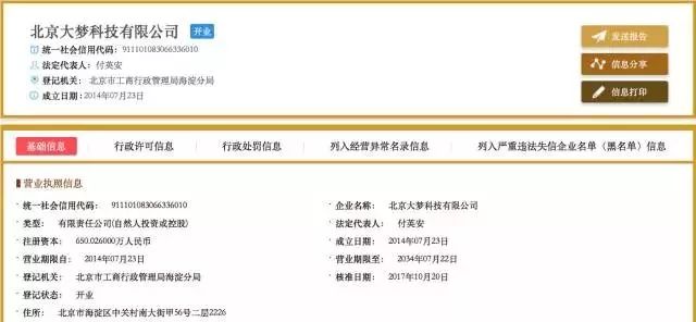 10月24日下午,有媒体来到北京大梦科技工商资料标注的注册地址——北京市海淀区人民大学北路33号院1号楼14层140371号。在现场发现,33号院为一栋写字楼,而据该写字楼物业公司的员工称,“14层并没有140371号,也从来没有听说过这家公司。”