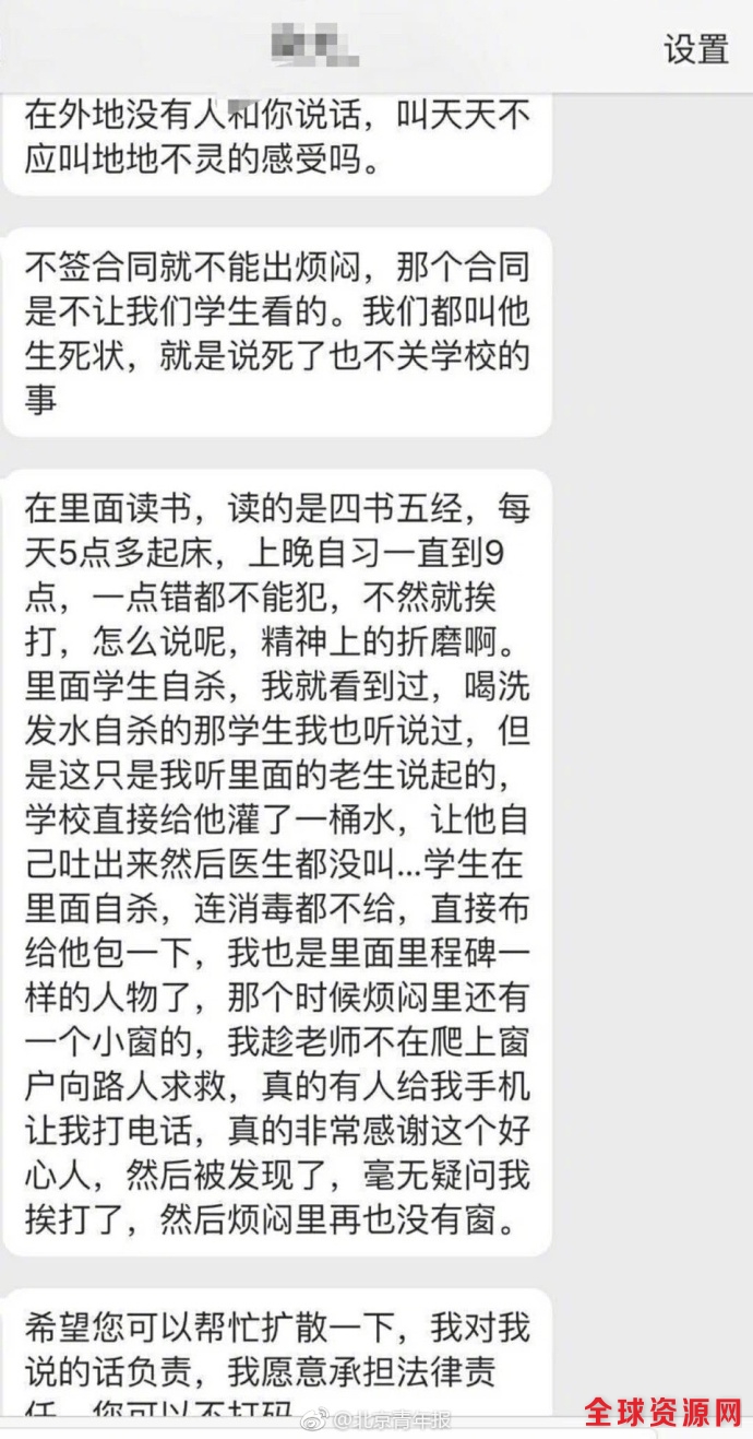多位曾被送入该学校的学生向北京青年报记者介绍,豫章书院老师通常用戒尺、龙鞭体罚学生,戒尺是大号的钢尺,龙鞭也是钢筋做的。“只要有违背老师意愿的就打你,比如队列动一下,或者晚上考德的时候故意出难题,答不上来暴力伺候。”一位学生称,他们日常与外界的联系就是一个月的一次通话。“打电话时老师要旁听,不能说真话,不能让父母来接走。”另有多位学生称,自己在书院曾见过有人因无法忍受体罚的痛苦试图割腕自杀,后被制止。