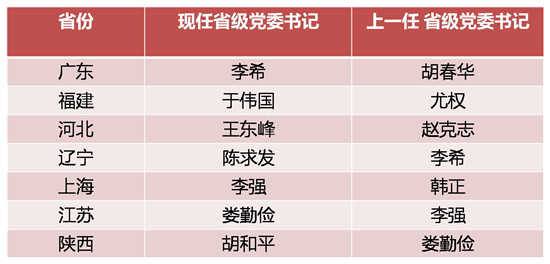 新华社北京10月28日消息,日前,中共中央决定:胡春华同志不再兼任广东省委书记、常委、委员职务;李希同志兼任广东省委委员、常委、书记,不再兼任辽宁省委书记、常委、委员职务。尤权同志不再兼任福建省委书记、常委、委员职务,于伟国同志任福建省委书记。赵克志同志不再担任河北省委书记、常委、委员职务,另有任用;王东峰同志任河北省委委员、常委、书记。陈求发同志任辽宁省委书记。