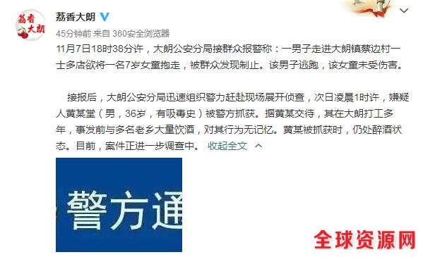原标题:东莞便利店45秒掳走女童男子被抓 事发前饮酒曾有吸毒史