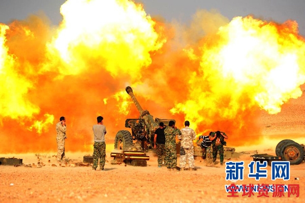 新华社记者在距阿布卡迈勒市西南约1公里处看到,政府军调集大批军力在此安营,向“伊斯兰国”目标密集发射炮弹。