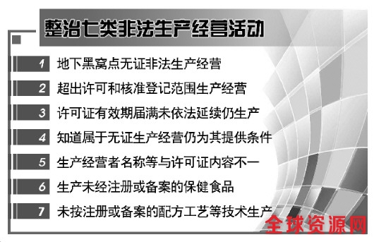 《通知》指出,治理的重点是未经许可生产经营食品和保健食品。主要包括以下七类:无证生产经营食品、保健食品,特别是地下黑窝点非法生产经营;超出许可和核准登记的经营范围从事食品、保健食品生产经营活动;许可证有效期届满未依法延续,仍从事生产经营活动;知道或应当知道属于无证生产经营,仍为其提供生产经营场所、运输、保管、仓储等条件;生产经营者名称、社会信用代码(个体生产经营者)、法定代表人(负责人)等与许可内容不一致;生产未经注册或备案的保健食品,擅自转让、伪造、涂改、倒卖、出租、出借注册证书等;未按注册或备案的产品配方、生产工艺等技术要求生产保健食品。