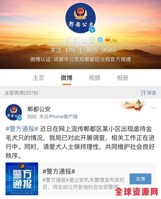 今日下午6时许,成都郫都警方也对金毛犬遭虐一事进行公开通报。