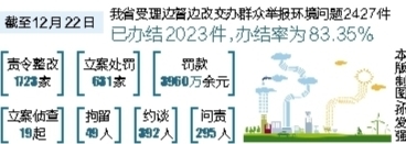 记者从省环境保护督察协调联络组交办案件落实组获悉,据统计,截至12月22日海南省受理边督边改交办群众举报环境问题2427件,已办结2023件,办结率为83.35%,责令整改1723家,立案处罚631家,罚款3960万余元,立案侦查19起,拘留49人;约谈392人,问责295人。